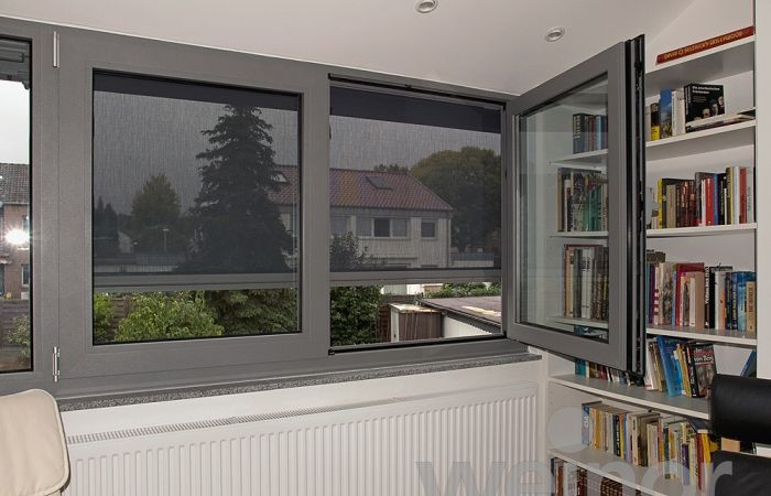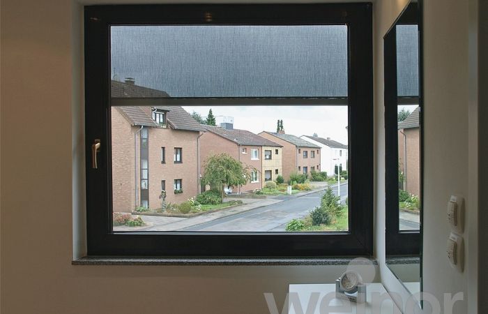 Für Fenster mit nur mässiger Windbelastung eignet sich die Senkrechtstoffstore mit Schienenführung.
