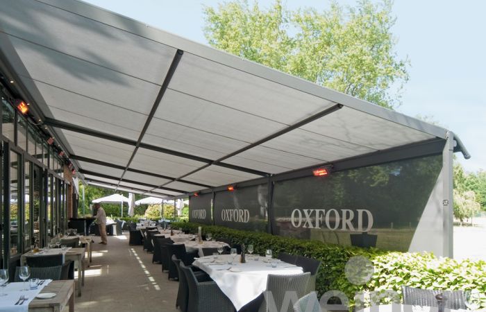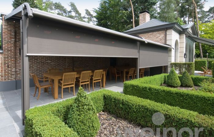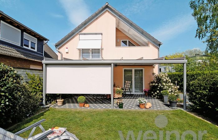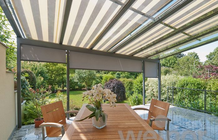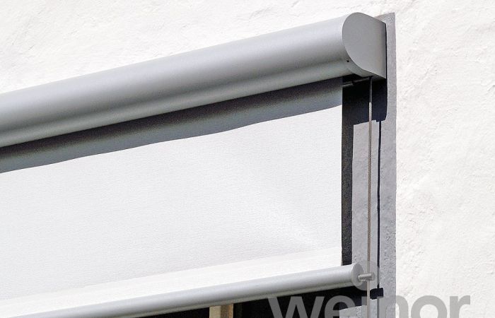 Tuch und Technik sind in einer extrakleinen, zierlichen Kassette untergebracht, dennoch lassen sich grosse Flächen damit beschatten.